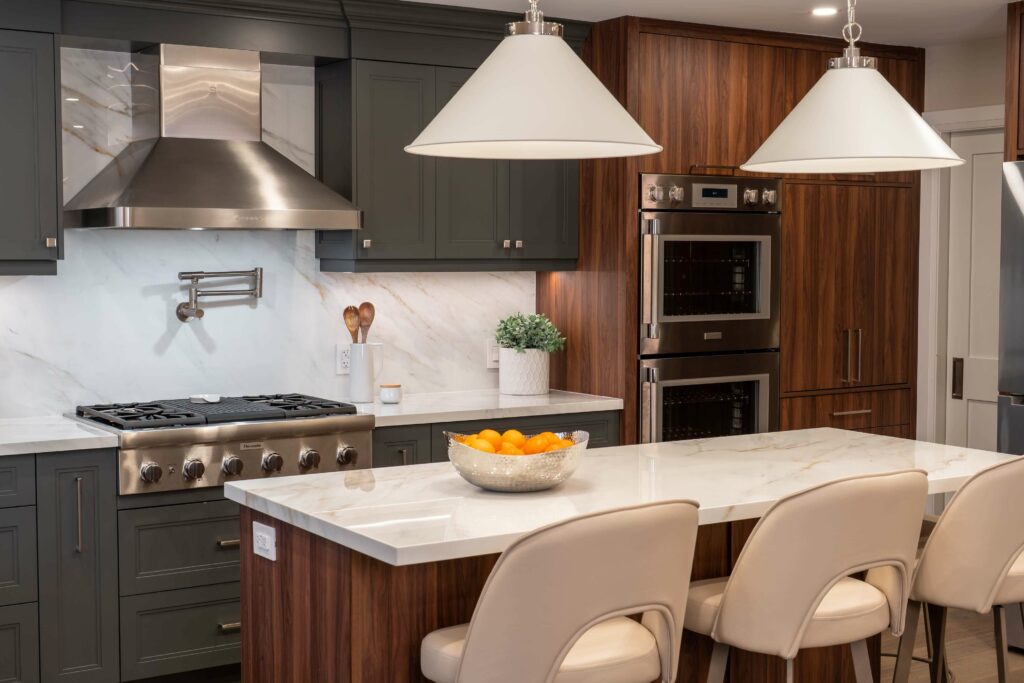 Through the Feasibility Study, we learned that deep, dark colors and a casual feel suited their style much more than a standard white kitchen. To create the right vibe, we combined rich woods with Shaker style cabinets painted in Benjamin Moore’s Iron Mountain (2134-30) and stainless steel appliances for a striking look. The white Borghini porcelain by Cava Surfaces we selected for the countertops and backsplash balances the space, allowing the features to really shine.