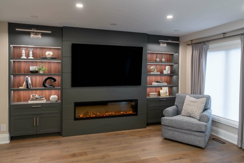 With an open floor plan, it’s so important for interior design to flow seamlessly from one space to the next, which is why we incorporated the same wood-and-grey palette along the feature wall in the living room. Custom lighting illuminates the Shaker style built-ins, which are painted the same color as the kitchen cabinets, and a slim Dimplex, IgniteXL® Built-in Linear electric fireplace provides a cooler alternative to its gas counterpart. With a mounted TV as a finishing touch, this updated space is a modern marvel.