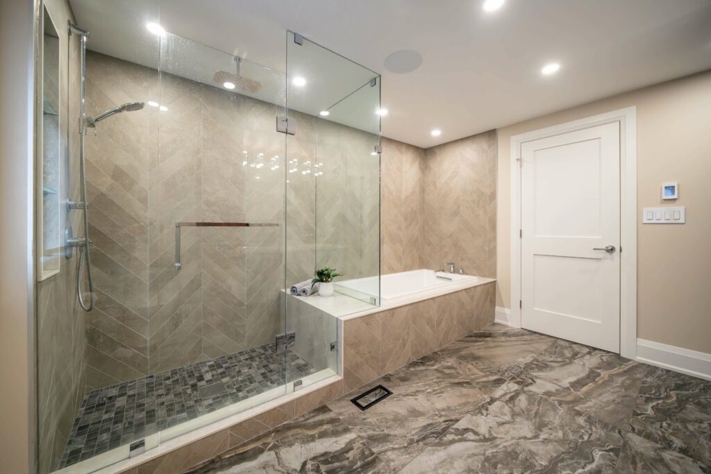 A large walk-in shower complete with a bench and a soaking tub guarantee hours of spa-like relaxation, while the well-lit vanity that features Taj Mahal porcelain tile by Canva Surfaces and a Richelieu pull-out storage system are certain to make getting ready a pleasure.