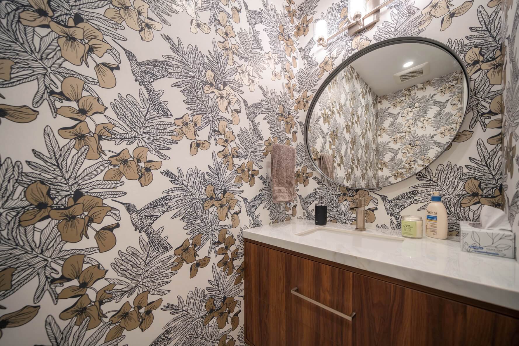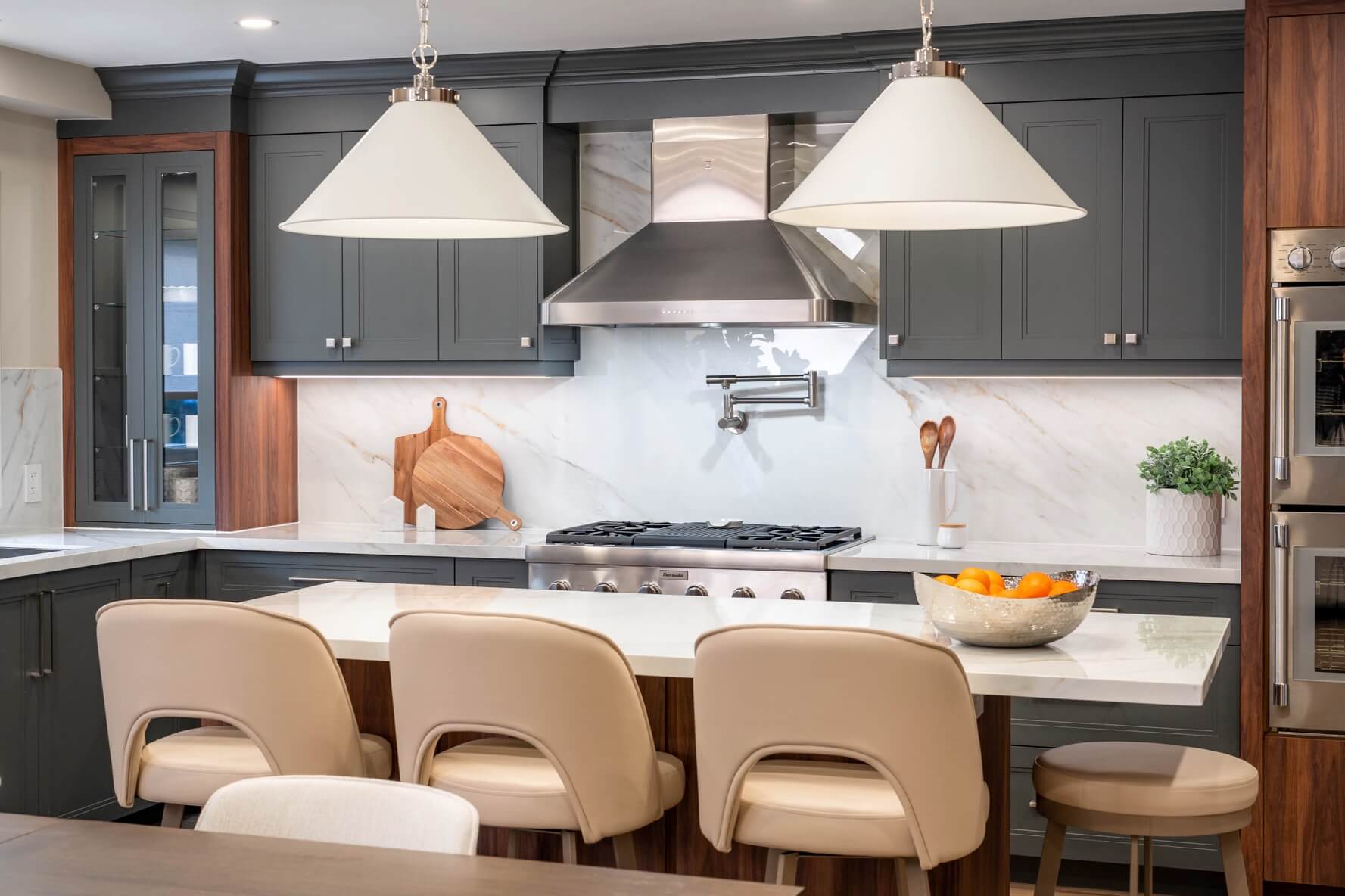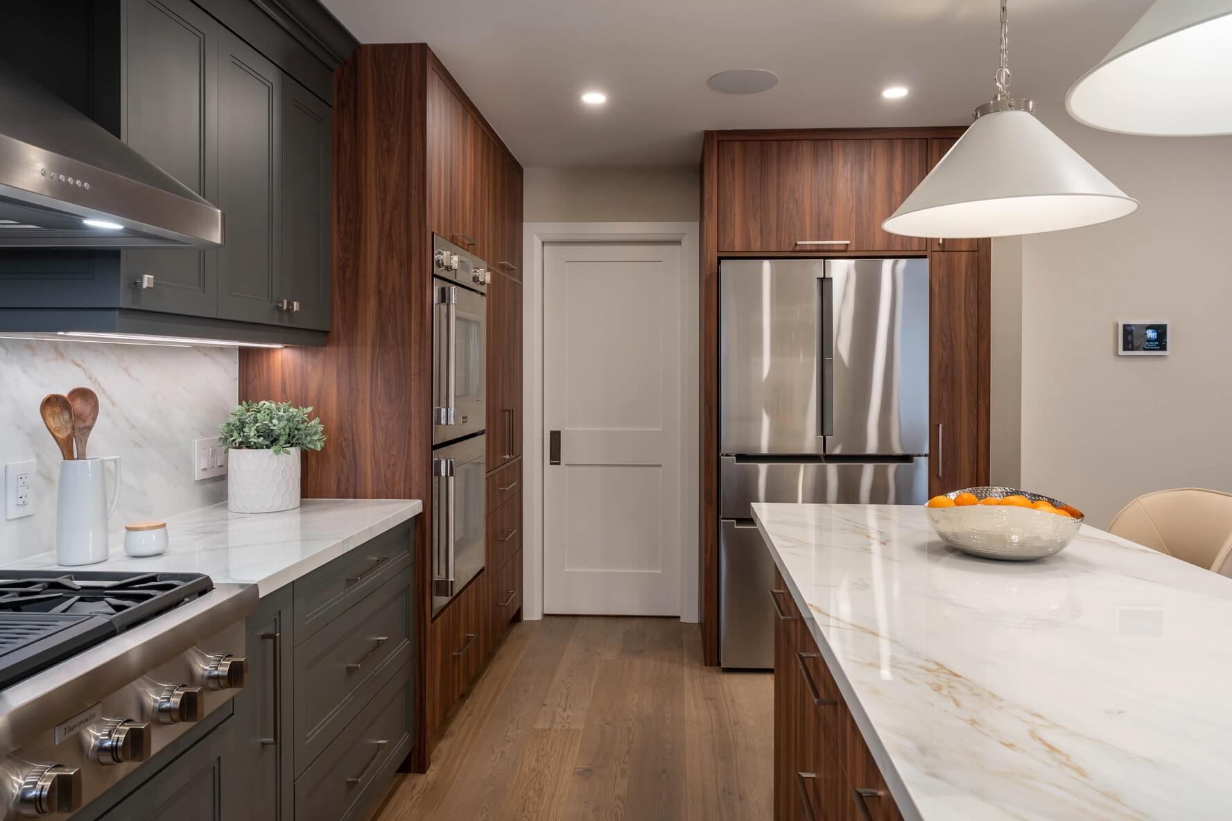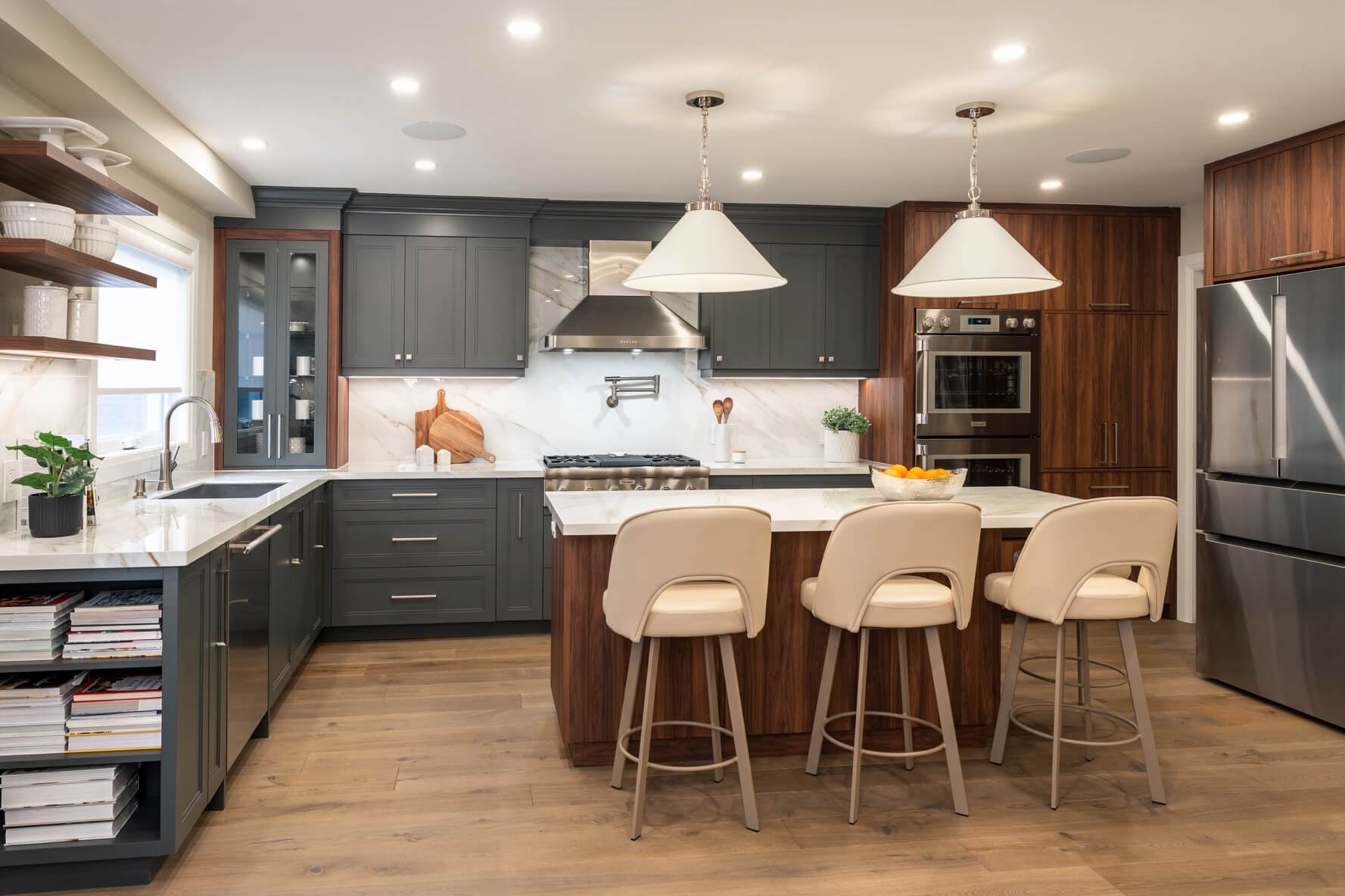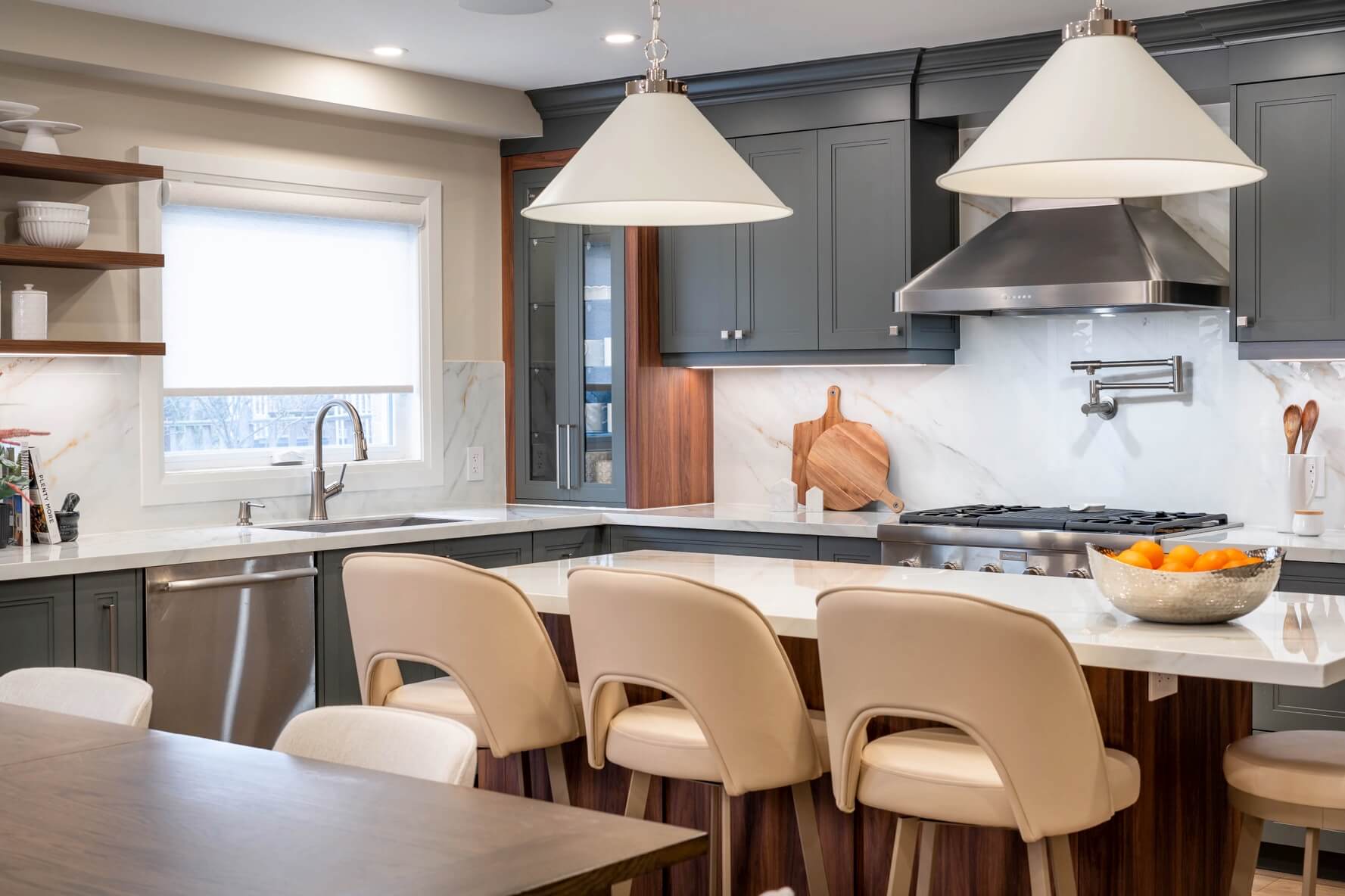 We expanded the kitchen into the original dining room to accommodate a new, spacious island and the much-needed pantry which we hid behind a pocket door next to the fridge. The colour palette throughout the space features dark gray cabinets, warm wood tones, stainless steel, and light-veined porcelain for just the right balance of casual sophistication.