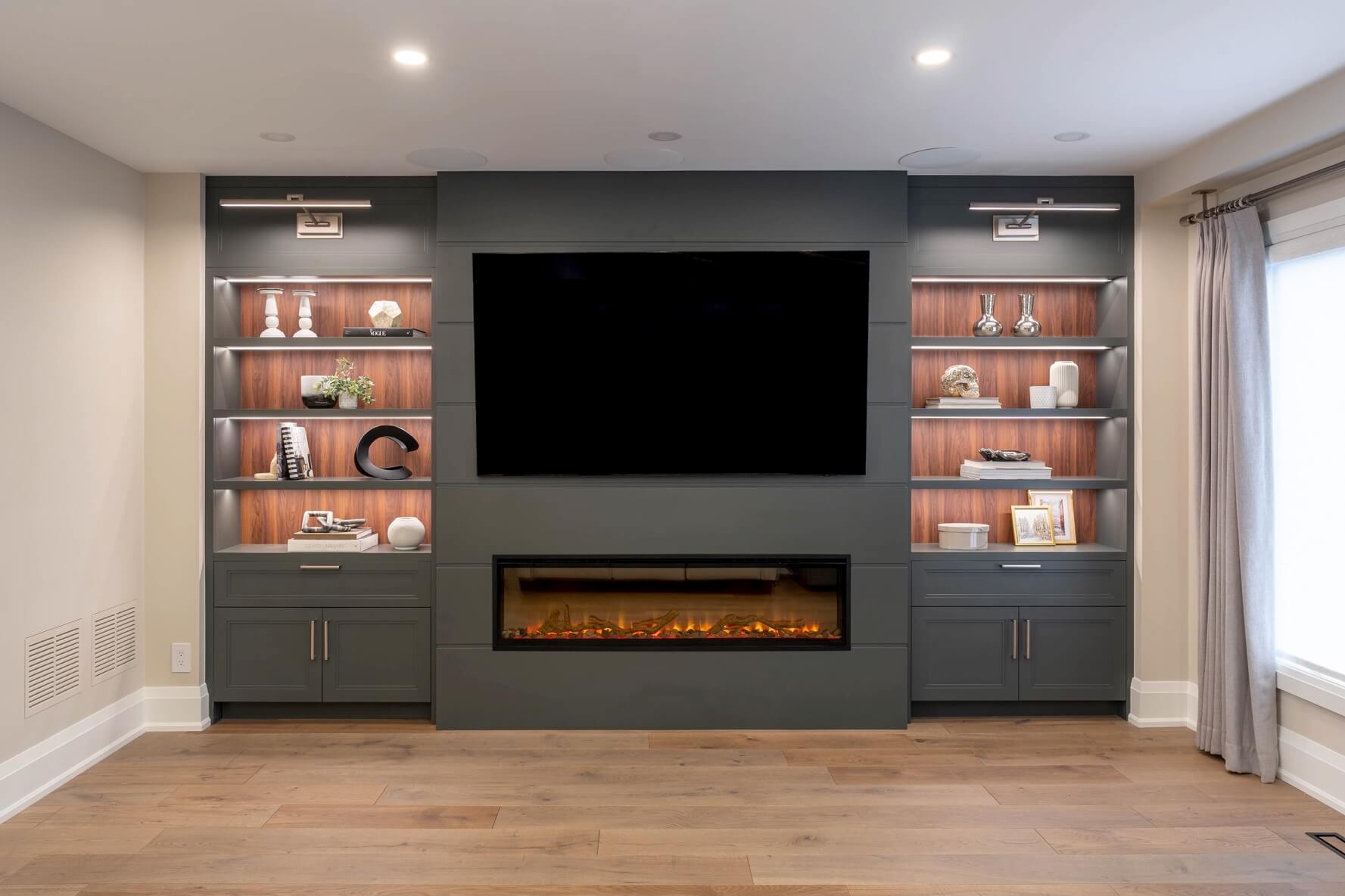 The same colours and style carry over into the living room for a cohesive look in this open space. Shaker-style built-ins in the gray we used for the kitchen cabinets flank a new electric fireplace and mounted TV.