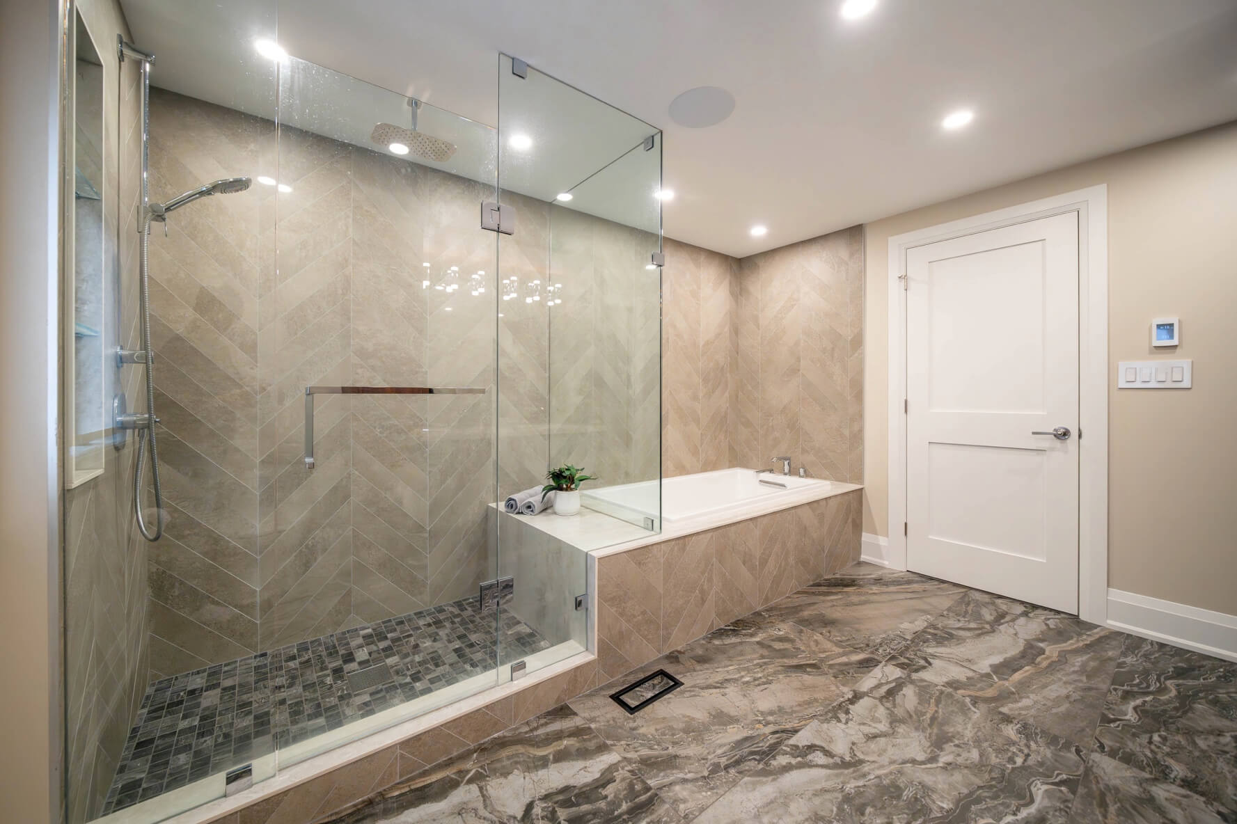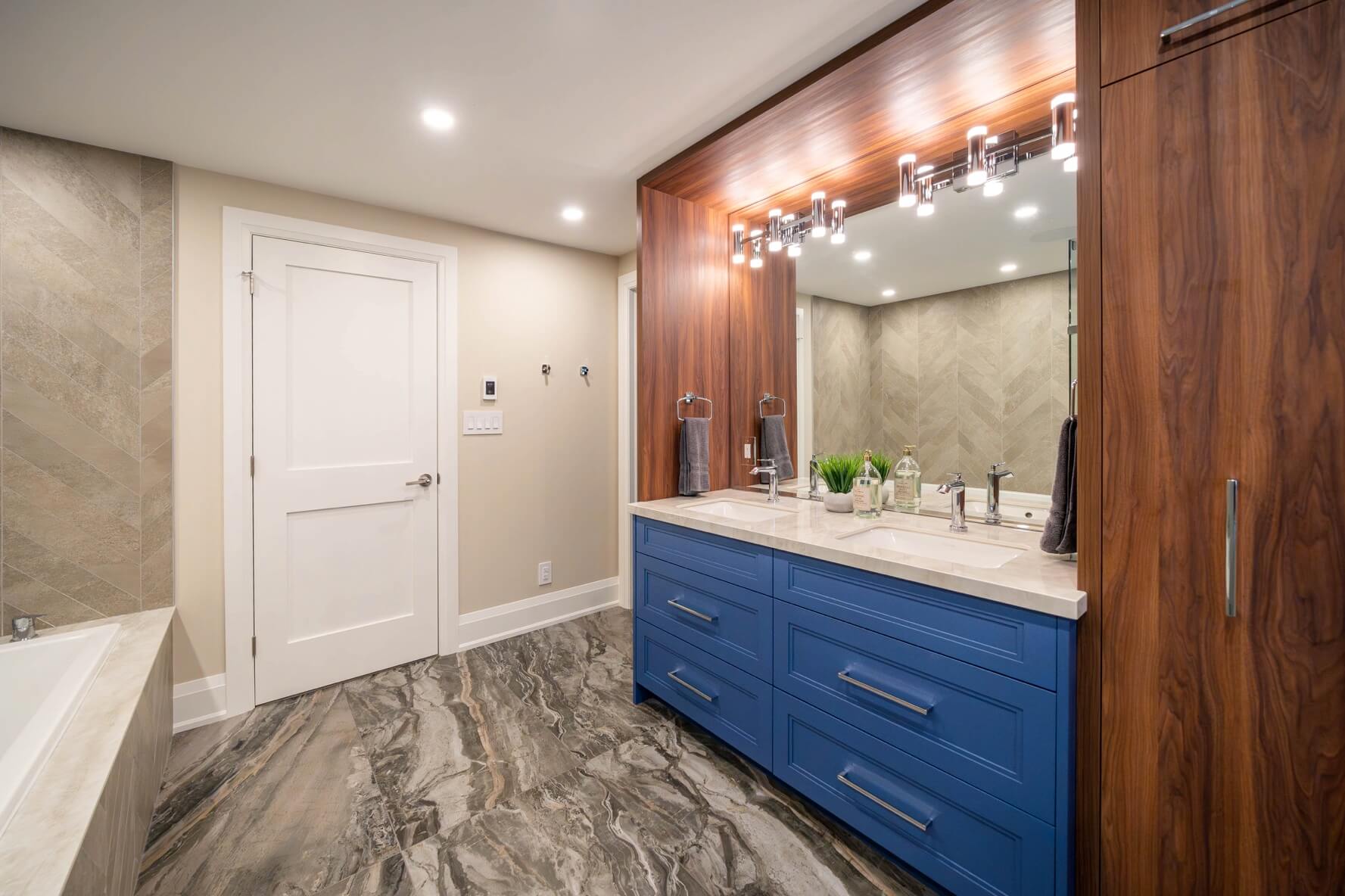 Finally, in the primary bathroom, we combined stunning marble and chevron tile with wood accents and a fun pop of bright blue on the vanity to create a space that is the perfect combination of luxury, elegance, and fun. Features include an enormous walk-in shower complete with a custom bench; a large soaking tub, and a custom storage system to make linen organization easy.